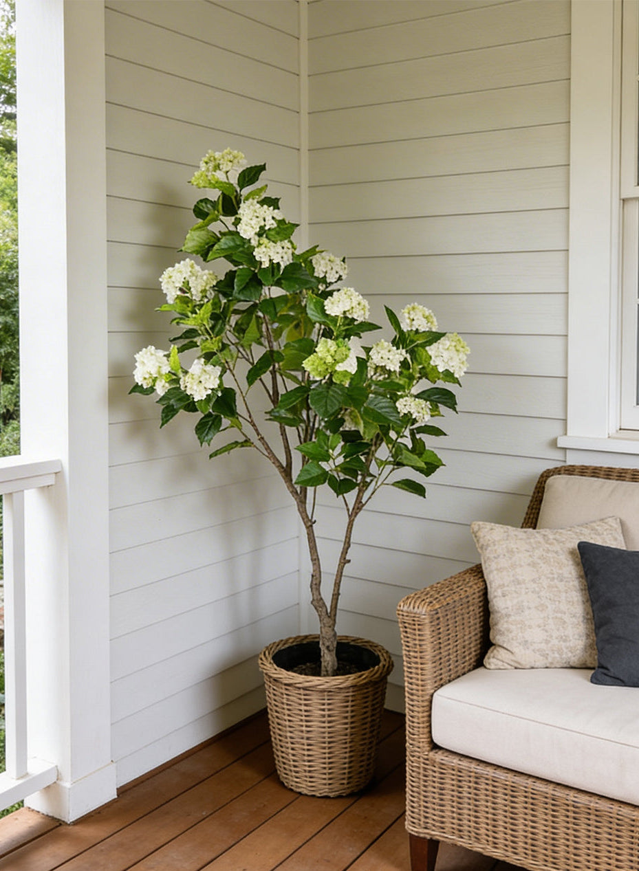 Features white hydrangea-style flower clusters, full green foliage, and branching stems to create the look of a decorative indoor tree without live plant care.