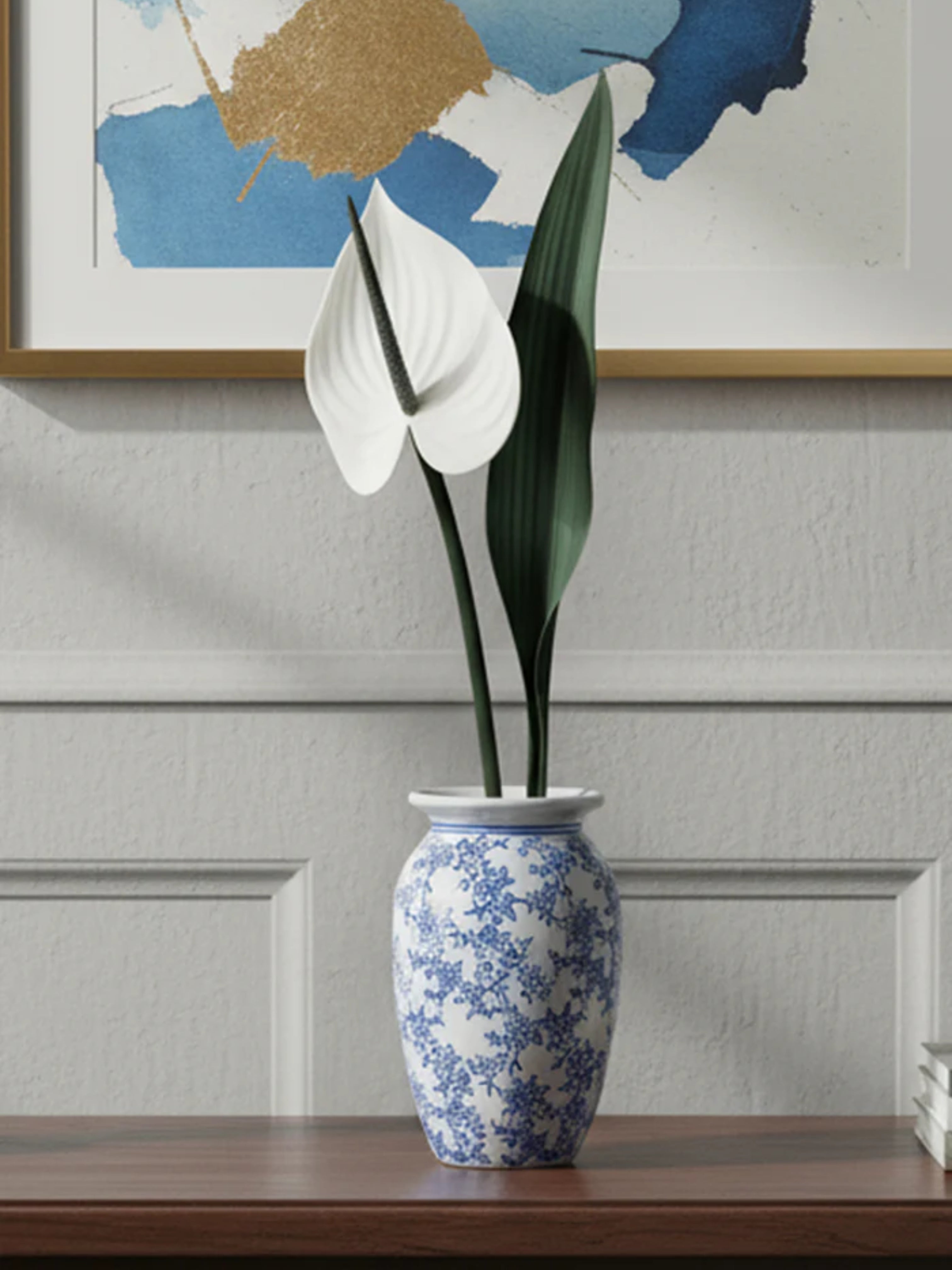 Elevate your space with this elegant blue and white ceramic vase featuring an intricate floral pattern. Inspired by timeless chinoiserie design, this vase adds a refined and classic charm to living spaces, tabletops, and event décor.