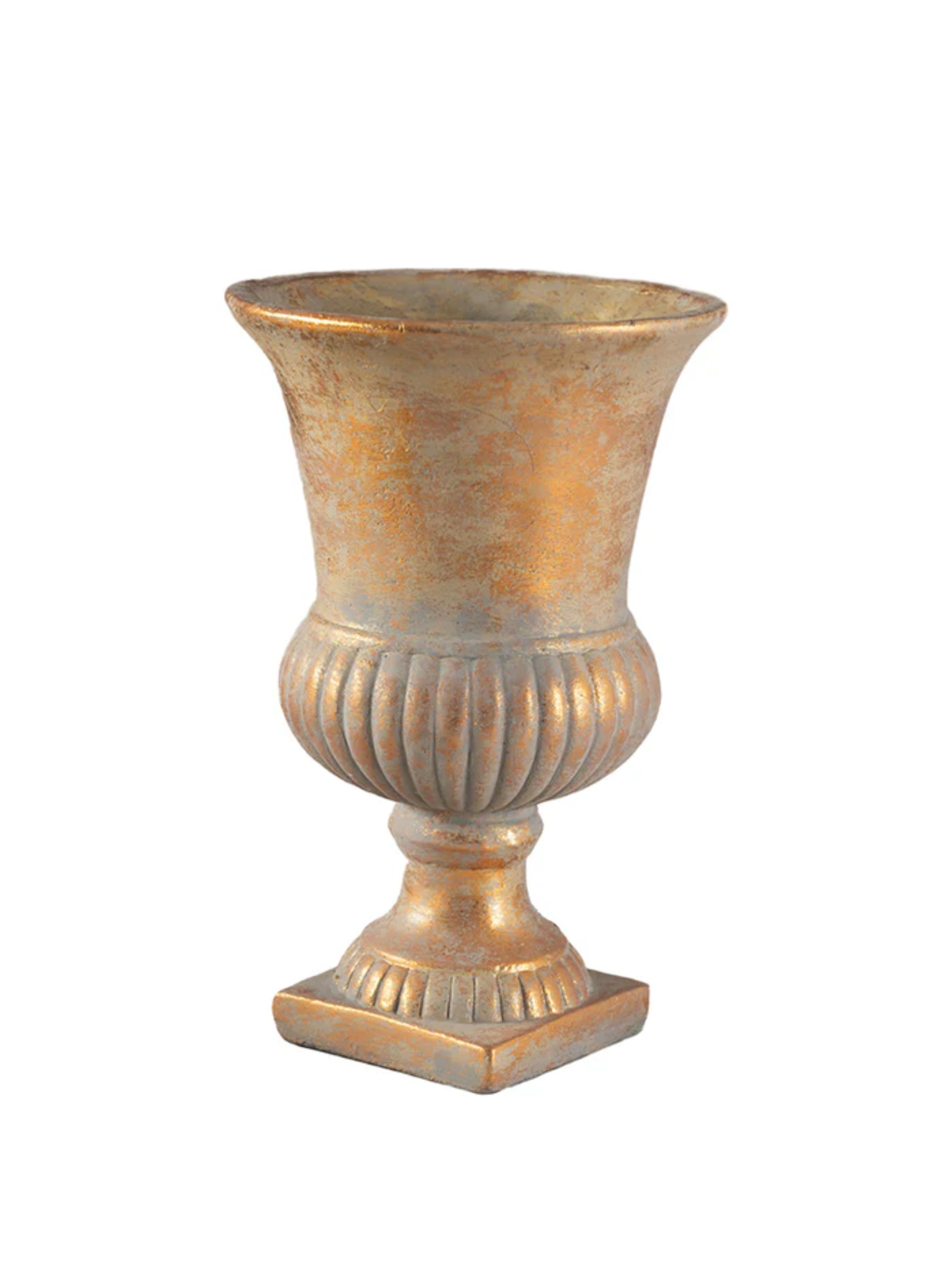 Add a touch of vintage elegance to your décor with this antique gold metal urn vase. Featuring a fluted bowl, ornate detailing, and a classic pedestal base, this statement piece brings old-world charm and sophistication to both traditional and contemporary spaces.